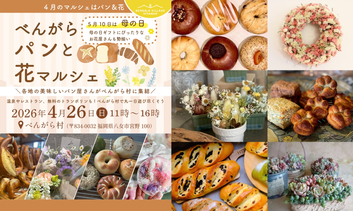 2026年4月26日(日)、福岡県八女市にある、べんがら村で「べんがらパンと花マルシェ」が開催されます。
