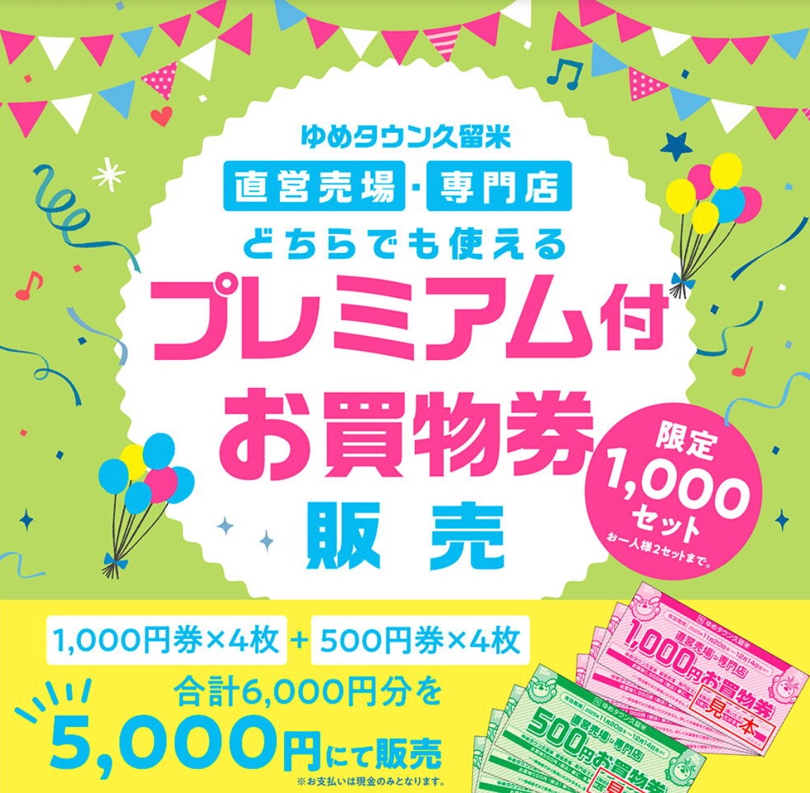 ゆめタウン久留米 直営売場・専門店どちらでも使えるプレミアムお買物券です。1000円券×4枚、500円券×4枚の合計6,000円分を5,000円で販売。限定1,000セット販売(お一人様2セットまで)